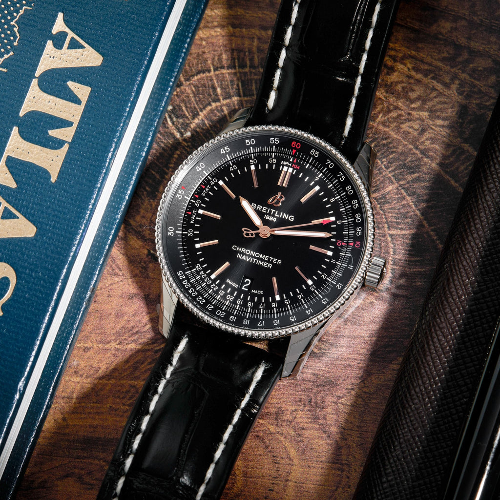 Refined and elegant, the Navitimer Automatic 41 combines the historic appeal of a true icon with the sophistication of a contemporary timepiece. Available in a variety of materials including stainless steel and 18k red gold, the 41 mm case features a beaded bezel and a range of elegant dial colors. Offered either with a matching bracelet or alligator strap that fits both a stainless-steel pin or folding buckle, the Navitimer Automatic 41 is powered by the Breitling Caliber 17, a COSC-certified chronometer.