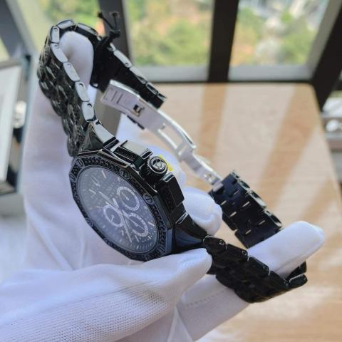 Multifunction dress watch adorned with 300 Swarovski® crystals on the black tone stainless steel case and strap with black dial. Water resistance up to 30 meters.