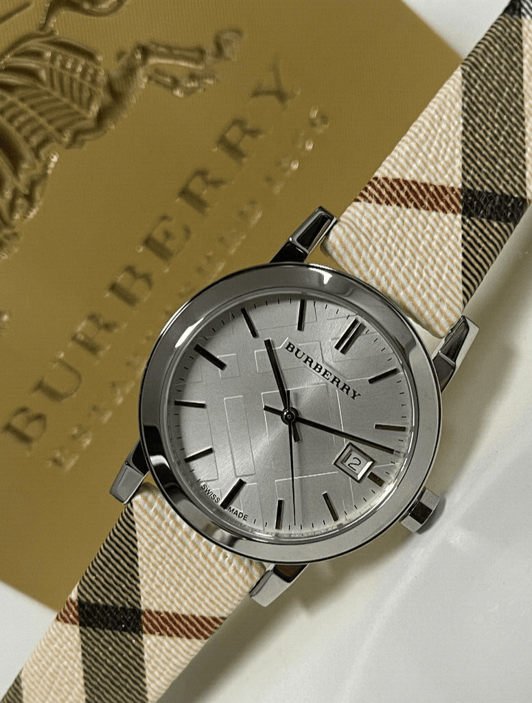 Brand: Burberry; Collection: The City; Article Code: BU9113; Type of product: Watch; Gender: Woman; Functions: Just Time, Date; Type of Movement: Quartz / Battery; Case Shape: Round; Case Material: Stainless Steel; Case Color: Steel; Case Diameter Ø: 38 mm; Type of Dial: Analog; Color of the Dial: Silver; Strap Material: Leather and Fabric; Strap Color: Beige; Water Resistance: 50 meters / 5 bar.