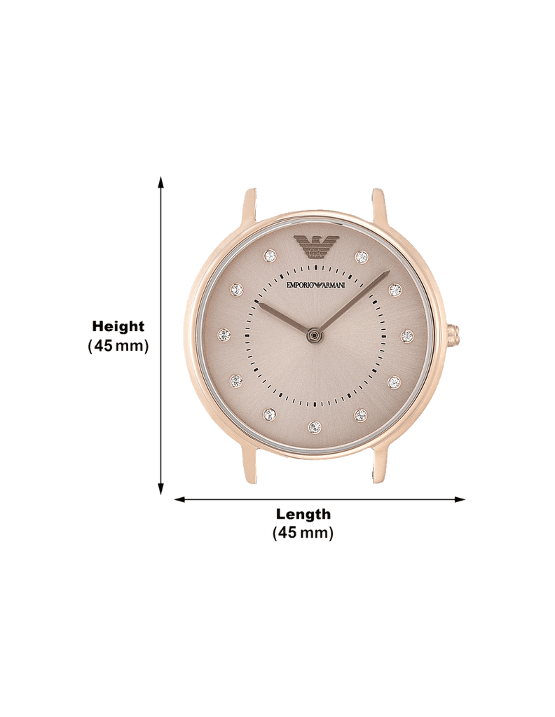 This shimmering ladies’ dress watch from Emporio Armani features a pink IP case, pink sunray dial with crystal dot hour markers and a polished pink IP mesh bracelet.