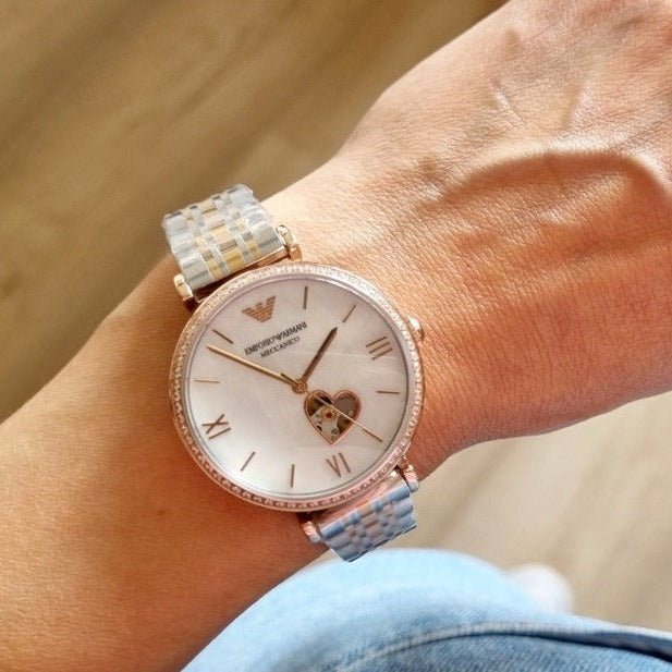 Emporio Armani ladies automatic watch in two tone stainless steel bracelet with best material. Silver stainless steel case which holds the watch mechanism. The crown is in small size attached with 3 hour. The dial of the watch is in shining mother of pearl colour. The logo is there at the place of 12 hour.
