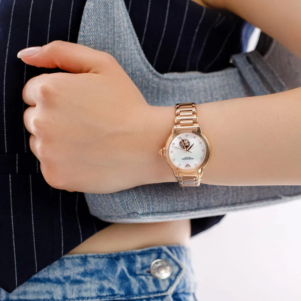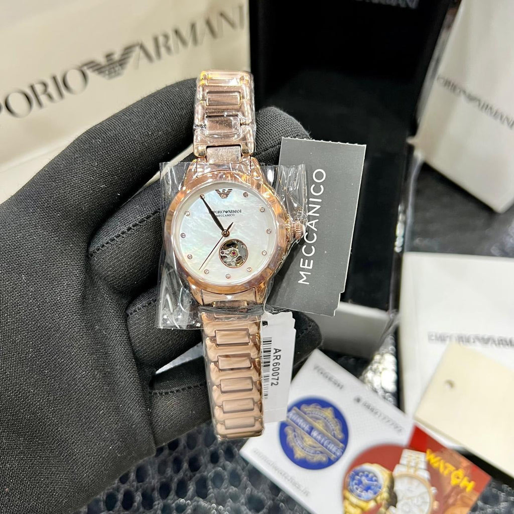 Emporio Armani Mia Meccanico Mother of Pearl Dial Rose Gold Steel Strap Watch for Women - AR60072