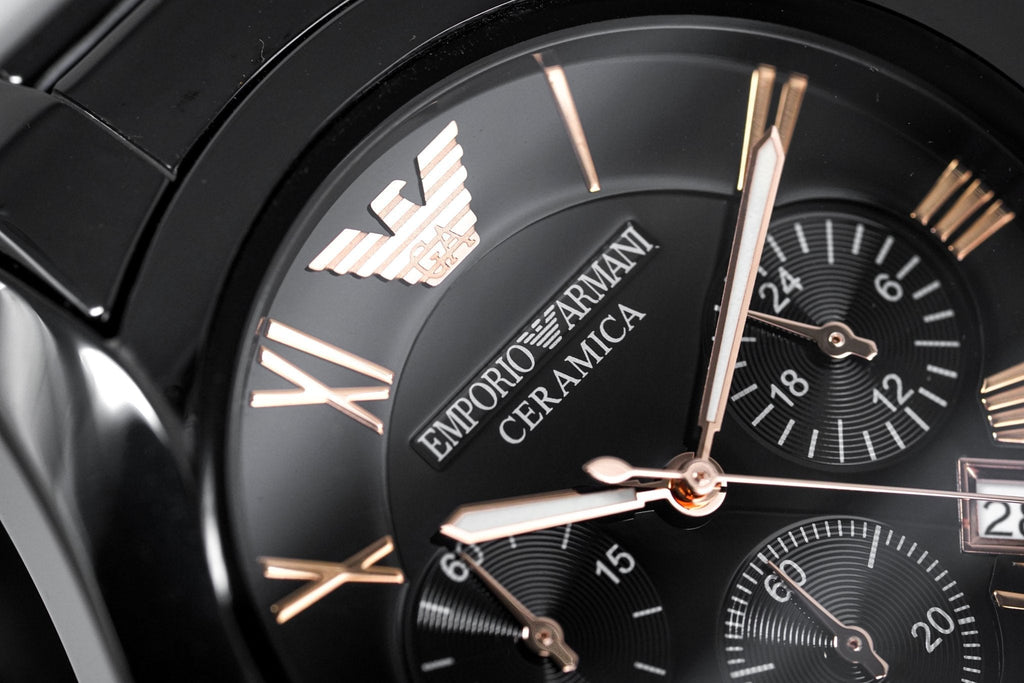 Black ceramic case with a black ceramic bracelet. Fixed black ceramic bezel. Black dial with luminous rose gold-tone hands and Roman numeral hour markers. The Emporio Eagle appears at the 12 o'clock position. Dial Type: Analog. Luminescent hands and markers. Date display between the 4 and 5 o'clock positions. Chronograph - three sub-dials displaying: 60 seconds, 60 minutes and 24 hours sub-dials.
