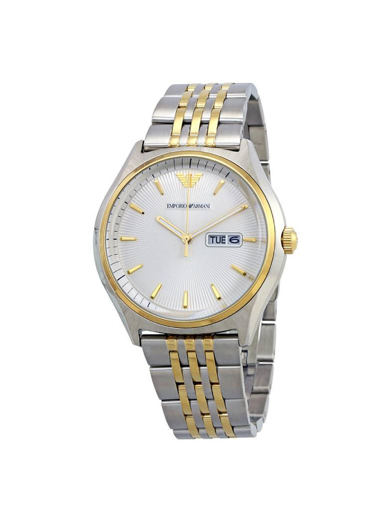 Emporio Armani Gent’s Watch has a Silver and gold-tone stainless steel case with a silver and gold-tone stainless steel bracelet. Fixed gold-tone stainless steel bezel. Cream dial with gold-tone hands and index hour markers. Dial Type: Analog. Day of the week and date display at the 3 o’clock position. Quartz movement.