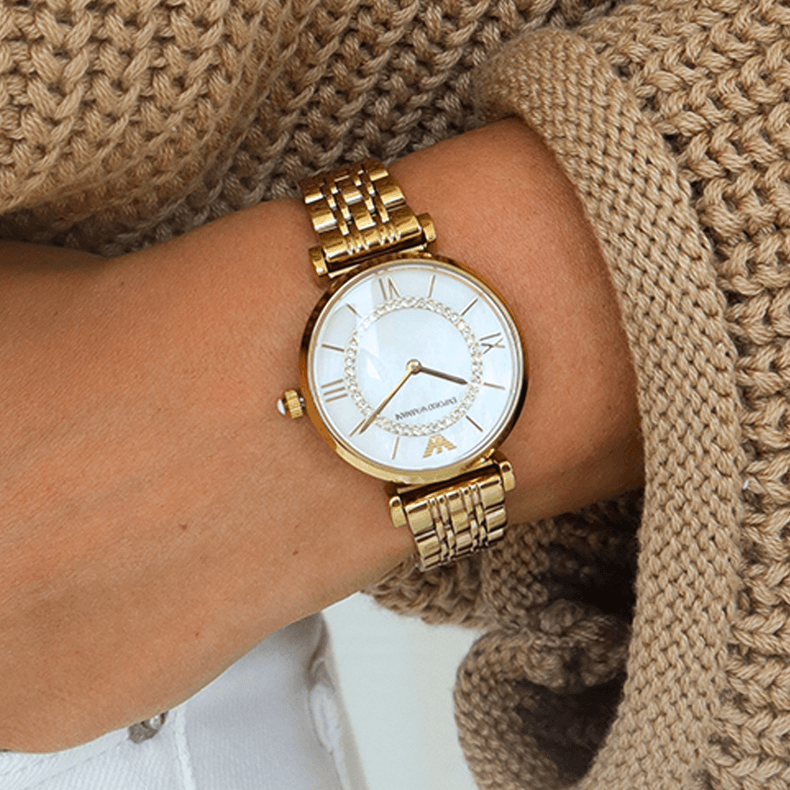Elevate your everyday elegance with the Emporio Armani Gianni T Bar, a timepiece that seamlessly blends sophistication with understated luxury. Featuring a luminous mother-of-pearl white dial that catches the light beautifully, this watch exudes refined femininity. The sleek gold steel strap complements the dial perfectly, creating a harmonious design that transitions effortlessly from office to evening. The iconic T-bar design adds a distinctive touch that sets this piece apart. Precision-engineered and crafted with premium materials, this Emporio Armani watch is an investment in timeless style that will enhance your collection for years to come.