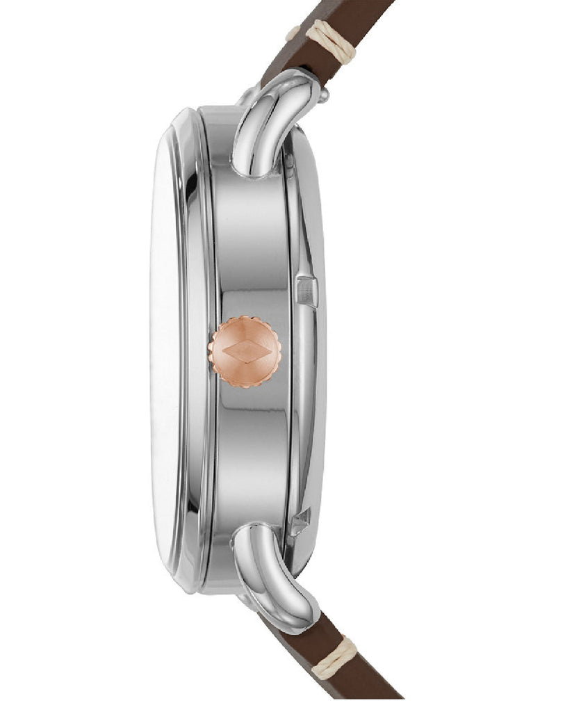 Stainless steel case with a brown leather strap. Fixed stainless steel bezel. Black (skeletal display) dial with luminous rose gold-tone hands and index hour markers. Arabic numeral appears at the 12 o'clock positions. Minute markers around the outer rim. Dial Type: Analog. Luminescent hands and markers.