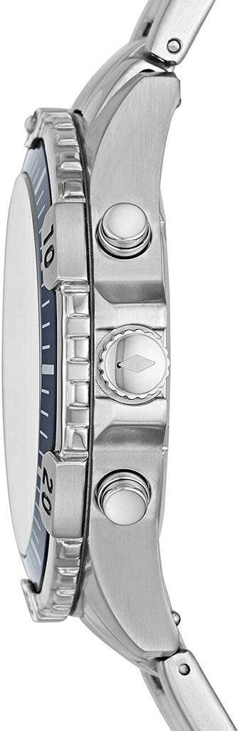 Fossil FS-5623 Metal Band Men Watch. The case is made out of silver stainless steel with a blue bezel, which stands for the high quality of the item, it has a blue color dial. This model has got 100 meters of water resistance. it can be worn in scenarios where it is likely to be splashed but not immersed in water and will be fine in rain. The watch is shipped with an original box and a guarantee from the manufacturer.