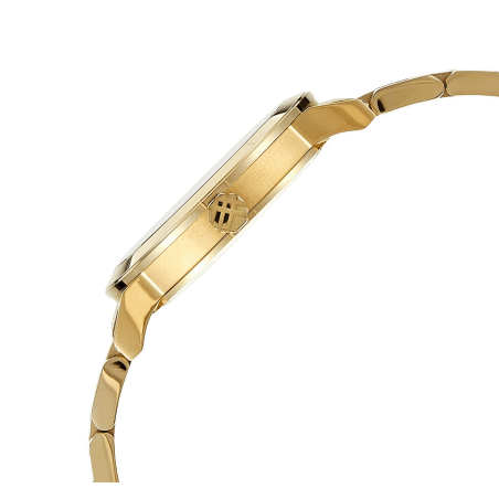 Stainless steel case with a stainless steel bracelet. Fixed stainless steel bezel. White dial with Gold-tone hands and index hour markers. Minute markers around the outer rim. The Burberry name appears below the 12 o’clock position. Dial Type: Analog. Date display at the 3 o’clock position. Quartz movement. Scratch resistant sapphire crystal. Solid case back.