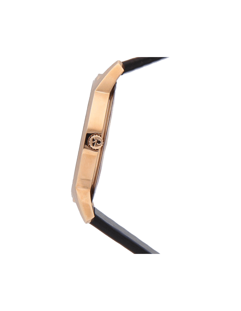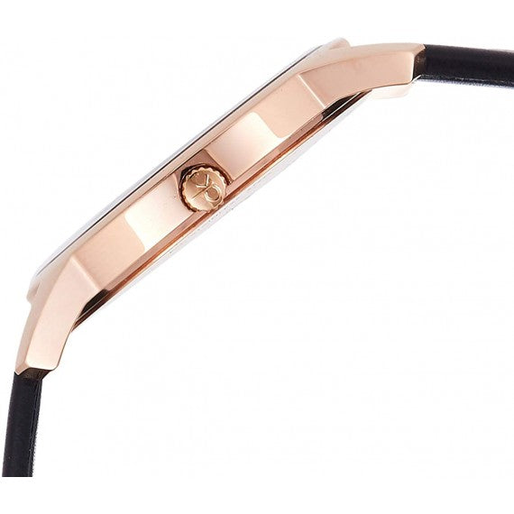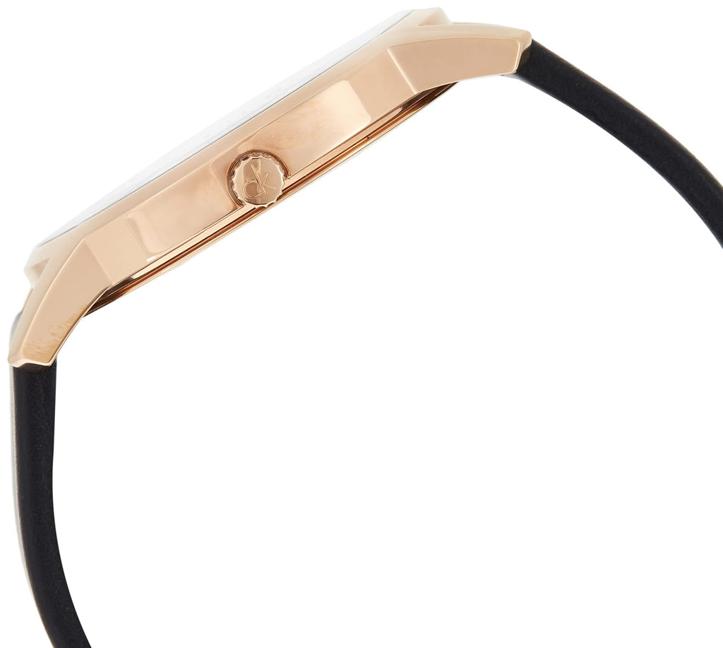 18kt rose gold-plated stainless steel case with a black leather strap. Fixed 18kt rose gold-plated bezel. Ebony black dial with luminous rose gold-tone hands and index hour markers. Dial Type: Analog. Luminescent hands. Date display at the 3 o'clock position. ETA Caliber F07.411 quartz movement. Scratch resistant mineral crystal. Pull / push crown. Solid case back. Round case shape. Case size: 43 mm. Case thickness: 8.7 mm. Band width: 22 mm. Tang clasp. Water resistant at 30 meters / 100 feet. Functions: date, hour, minute, second. City Series. Casual watch style. Watch label: Swiss Made. Calvin Klein City Quartz Ebony Black Dial Unisex Watch K2G2G6C3.