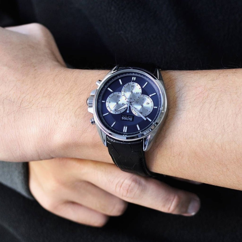 The Hugo Boss Driver Chronograph combines sophisticated style with functional precision, making it an essential timepiece for the modern man. Featuring a striking black dial and premium black leather strap, this watch delivers timeless elegance that transitions seamlessly from boardroom to weekend. The chronograph functionality adds practical versatility for timing important moments, while the refined design reflects Hugo Boss's commitment to quality craftsmanship. Built for those who demand both performance and prestige, this Driver watch elevates any wardrobe with understated luxury and dependable accuracy.