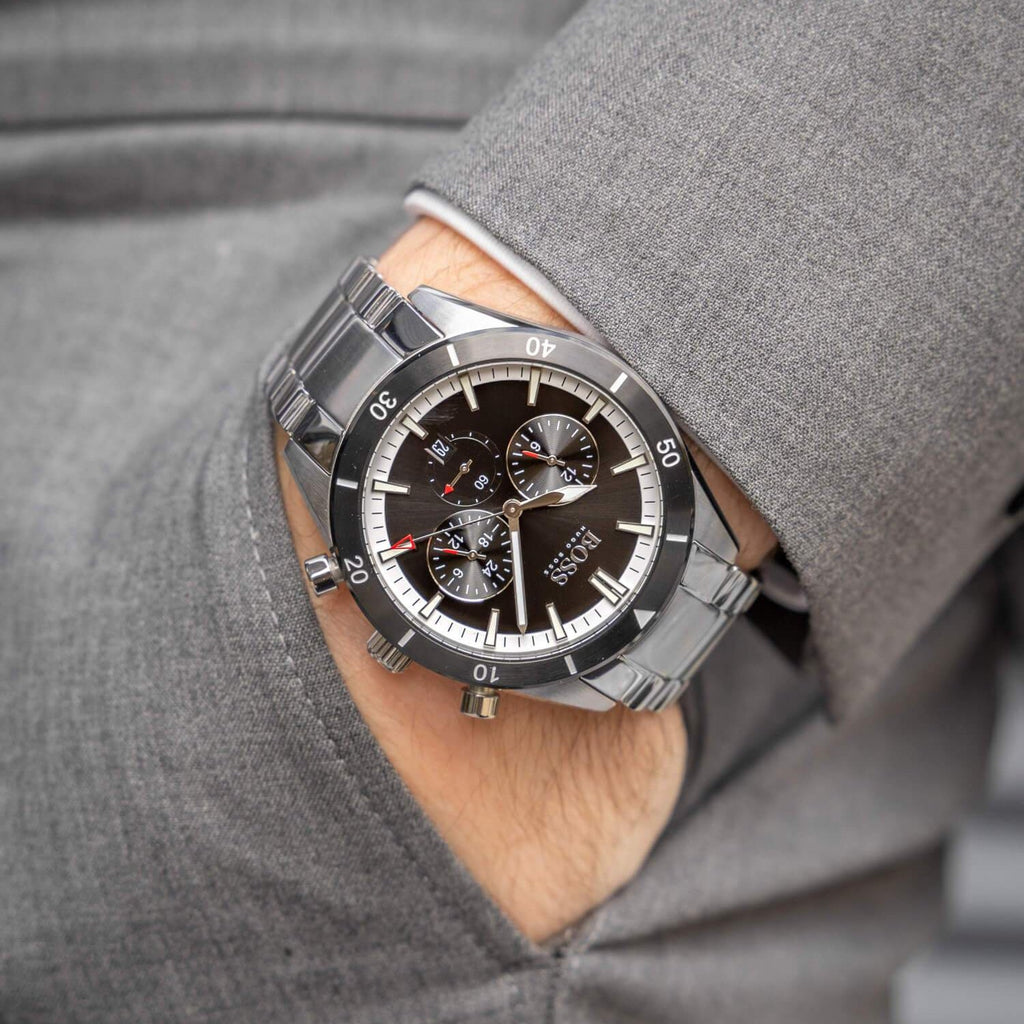 The Hugo Boss Santiago Chronograph combines timeless elegance with sophisticated functionality. Featuring a striking black dial set against a polished silver steel case and matching bracelet, this timepiece delivers the refined aesthetic that defines the Hugo Boss brand. The chronograph subdials provide practical timing capabilities, making it equally suited for boardroom meetings or weekend adventures. Built with precision engineering and quality materials, the Santiago is a versatile watch that elevates any wardrobe while offering reliable performance you can depend on daily.