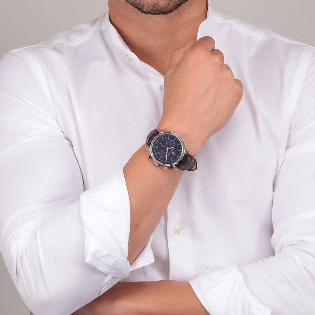 Experience luxury at its finest with the Maserati Epoca Chronograph Watch for Men. This elegant timepiece features a stunning blue dial and brown leather strap, exuding sophistication and style. The chronograph function adds practicality, making it the perfect accessory for any occasion. Elevate your wrist game and stand out from the crowd with this exquisite watch.