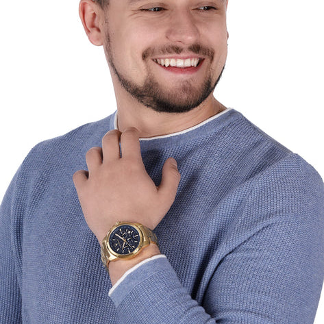 MASERATI men's watch from the SUCCESSO collection. Watch with MVT movement. SEIKO VD53, Chronograph function. Dial: UPMR 3-contactor chronograph at 1-12 o'clock. w/date display, polished and satin finish, BLUE colour. GUILLOCHE'. Band Type: Cap-Folded. Strap material: Gold colored metal bracelet.