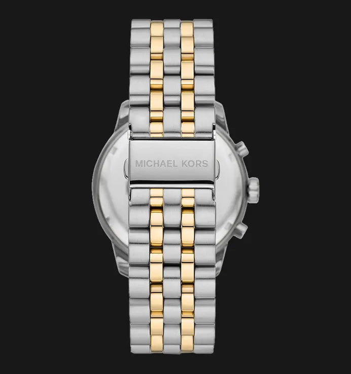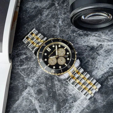 A simple yet stylish timepiece for the urban men, this analog watch from Michael Kors will give you the statement look you have been coveting for. The black round dial is protected by a mineral glass. This sporty 44mm two-tone stainless steel chronograph watch is effortlessly cool. Featuring a silver and gold-tone multi-link bracelet with a black dial and sport topring, the subtle pave subeyes make this timepiece pop. Besides, it is completed with a fold-over clasp with double push button safety clasp to ensure a secure fit on the wrist.