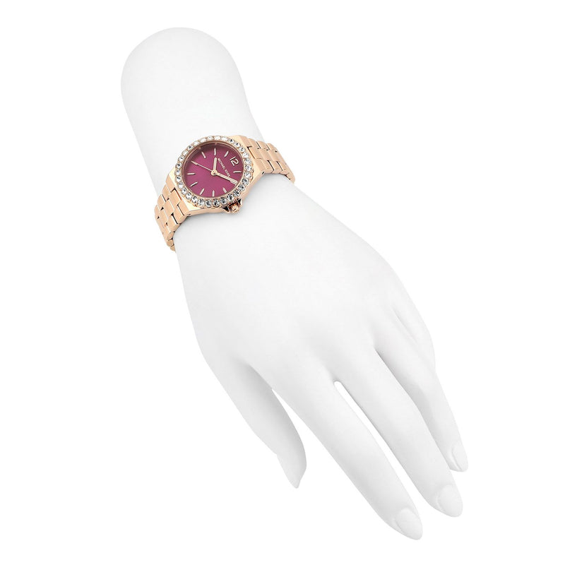 Michael Kors' 30mm Lennox watch features a berry sunray dial, three-hand movement , rose gold-tone stainless steel bracelet and an oversized pavé topring.