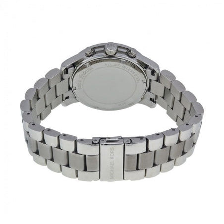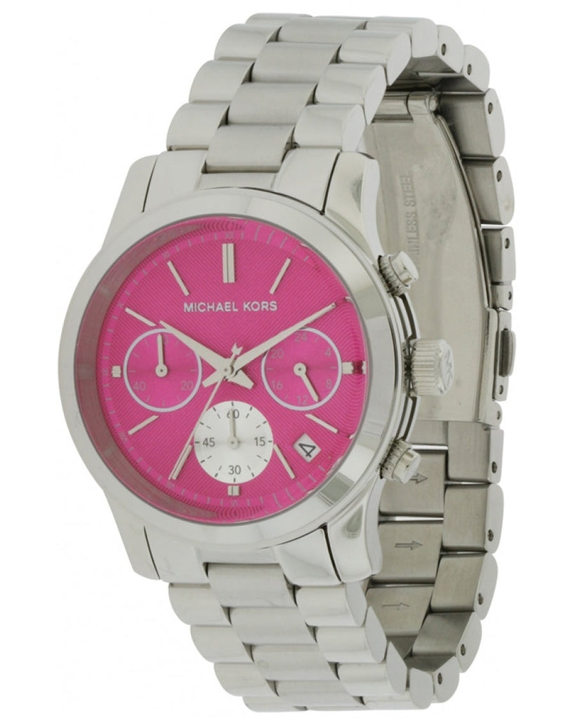 This Michael Runway Chronograph Pink Dial Ladies Watch MK6160 comes in stainless steel case with a stainless steel bracelet. Fixed stainless steel bezel. Pink dial with silver-tone hands and index / Roman numeral hour markers. Minute markers around the outer rim. Dial Type: Analog. Date display between 4 and 5 o'clock positions. Chronograph - three sub-dials displaying: 60 second, 30 minute and 24 hour.