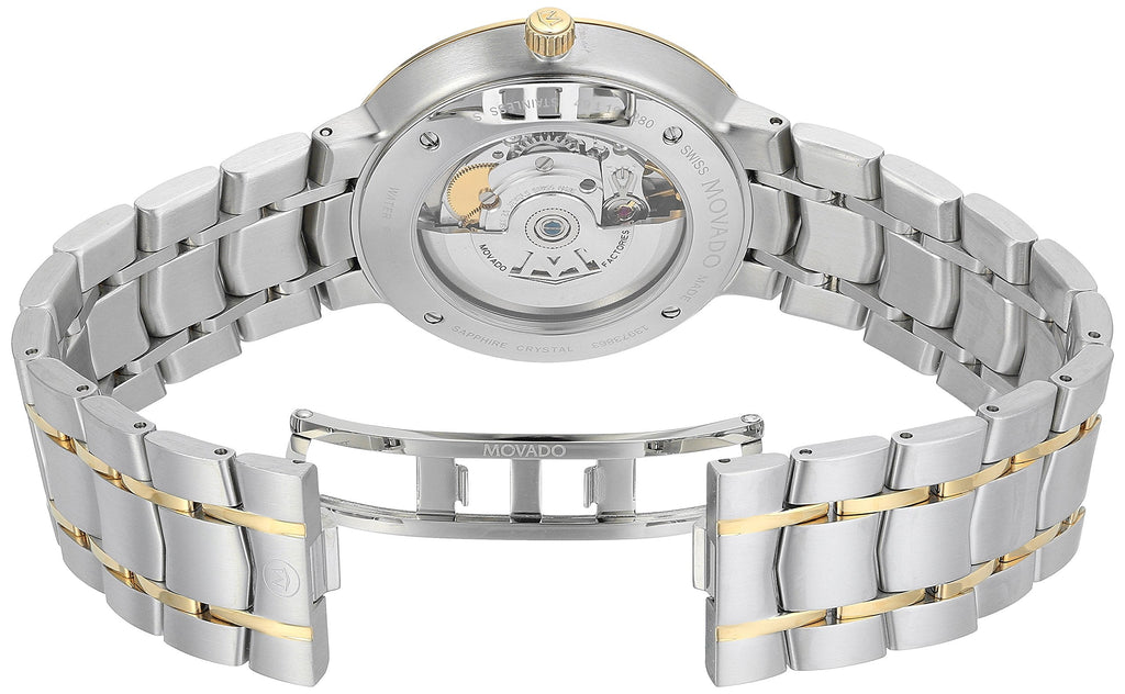 Movado Watch 1881 Automatic 606916. Mens 1881 Automatic watch, 39.5 mm stainless steel and yellow gold PVD finished case with exhibition back, round bi level black 3 hand dial with gold toned dot and hands, stamped hour markers and minute index, gold toned accents and round date display, two toned stainless steel bracelet with chevron shaped links and butterfly deployment clasp.