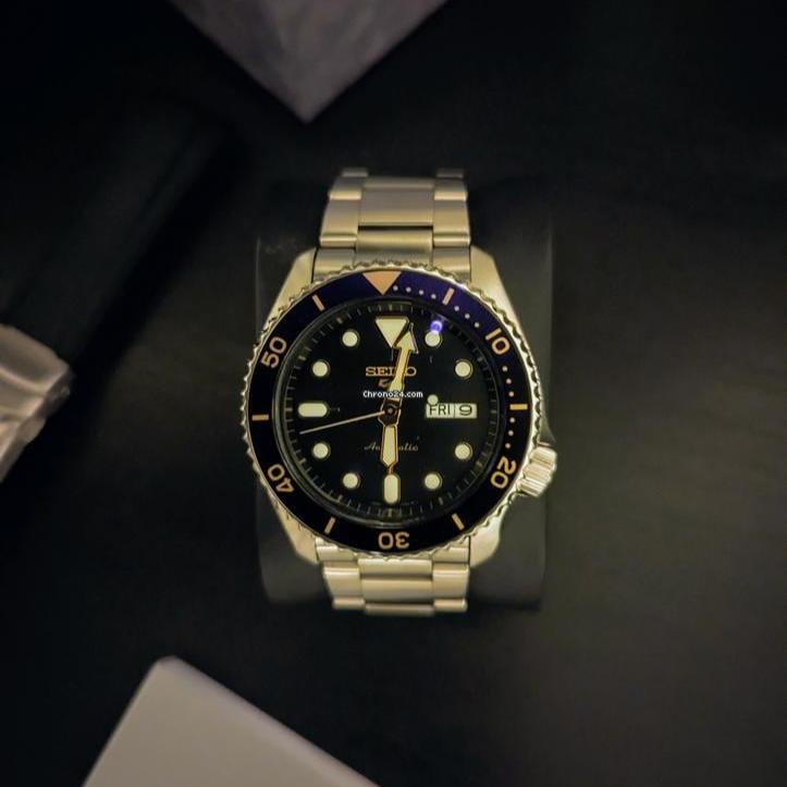 Seiko 5 Sports SRPD57K1 Metal Band Men Watch. The case is made out of silver stainless steel with a black bezel, which stands for the high quality of the item, it has a black color dial. This model has got 100 meters of water resistance. it can be worn in scenarios where it is likely to be splashed but not immersed in water and will be fine in rain. The watch is shipped with an original box and a guarantee from the manufacturer.