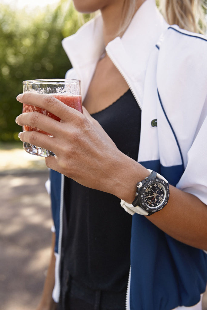 - Crown & chronograph button with matching white accents.