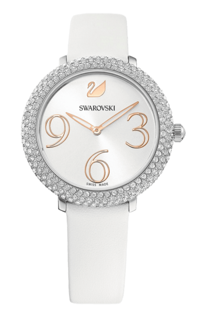 Swarovski women's time only watch from the crystal frost collection. Model with steel case of 34 mm diameter, bezel with 178 crystals cry. Silver dial with sunray pattern. K1 mineral glass. Watch with arabic numerals and rose gold plated hands, white genuine leather strap with rose gold plated buckle length of 18 cm and quartz movement. Water resistance is 5 atm. Swiss made watch. The reference is 5484070