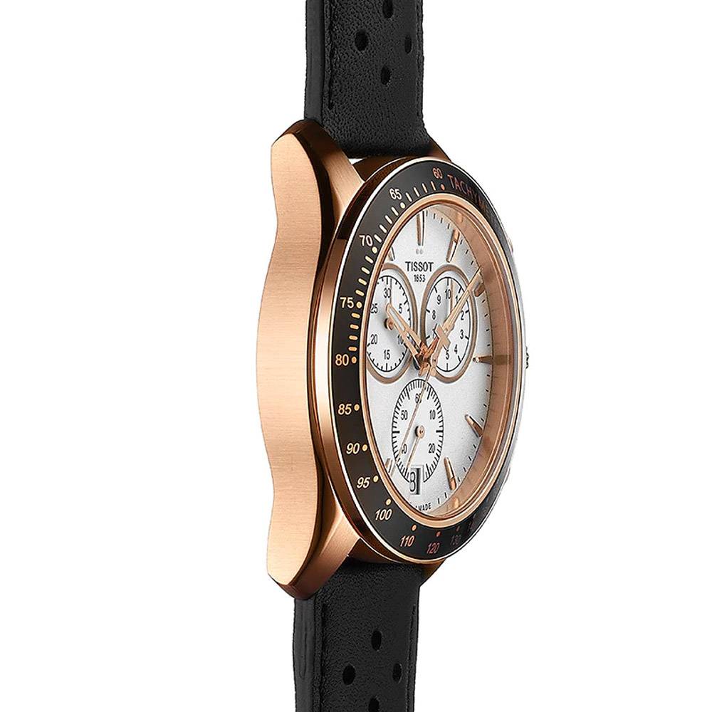 Rose gold PVD stainless steel case with a black microperforated leather strap. Fixed rose gold PVD bezel with a black aluminium top ring showing tachymeter markings. Silver dial with luminous rose gold-tone hands and index hour markers. Minute markers around the outer rim. Dial Type: Analog. Luminescent hands and markers. Date display at the 6 o'clock position. Chronograph - three sub-dials displaying: 60 second, 30 minute and 1/10th of a second. Quartz movement. Scratch resistant sapphire crystal. Screw down crown. Solid case back. Case size: 42.5 mm. Case thickness: 11.22 mm. Round case shape. Band width: 22 mm. Tang clasp. Water resistant at 100 meters / 330 feet. Functions: chronograph, tachymeter, date, hour, minute, second. Sport watch style. Watch label: Swiss Made. Tissot V8 Chronograph Silver Dial Men's Watch T106.417.36.031.00.