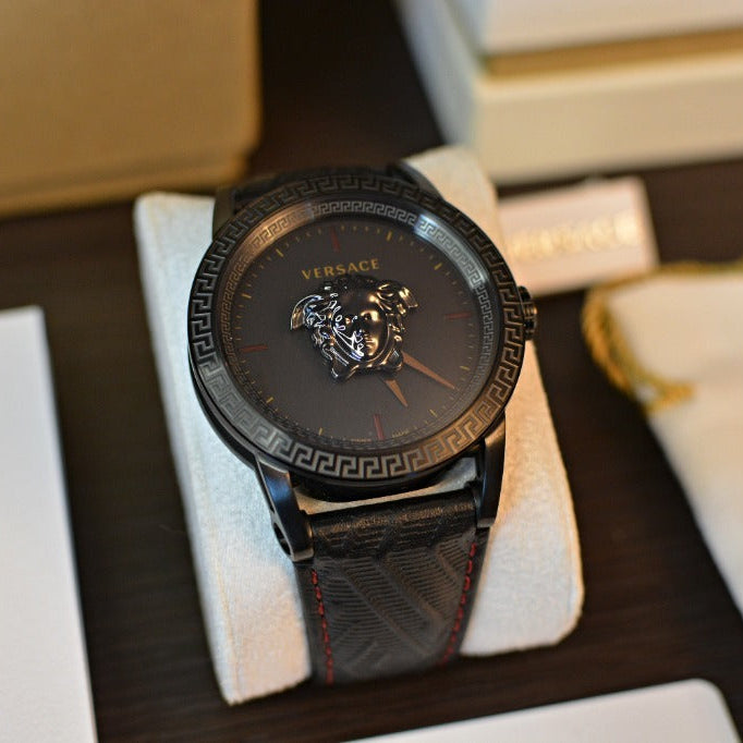 Elevate your wrist with the Versace Palazzo Empire, a masterpiece of Italian luxury and timeless sophistication. This striking timepiece features a bold black dial paired with a refined black leather strap, delivering understated elegance with unmistakable prestige. The Palazzo Empire embodies Versace's legendary craftsmanship and design heritage, making it the perfect statement piece for the discerning gentleman who refuses to compromise on style. Whether worn to the boardroom or evening events, this watch commands attention while maintaining an air of refined restraint. Experience the confidence that comes with owning an authentic Versace creation—where exceptional quality meets iconic design.