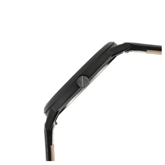 Its genuine leather strap exudes a black hue for an elevated look. It features a round-shaped black dial with an AX logo encased in a case of 42 mm diameter, stick indices and plain 3-hand quartz movement.