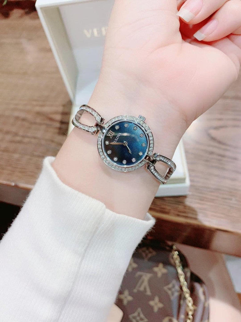 Dress her wrist in the elegant luxury of this Bulova dress watch. Crafted in stainless steel, this quality timepiece features a black mother-of-pearl dial, silver-toned hands, and crystal-accent markers. The crystal-accented bezel and bangle bracelet creates a sleek profile, and the bracelet secures with a jewelry clasp. Ensuring accuracy, the Japanese quartz movement keeps you right on time. Water-resistant to 30 meters, this wristwatch includes a three-year limited manufacturer's warranty. We are an authorized Bulova dealer.