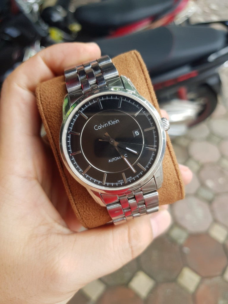 Stainless steel case with a stainless steel bracelet. Fixed stainless steel bezel. Black dial with luminous silver-tone hands and index hour markers. Minute markers around the outer rim. Dial Type: Analog. Luminescent hands. Date display at the 3 o'clock position. Automatic movement. Scratch resistant mineral crystal. Pull / push crown. Transparent case back. Round case shape. Case size: 42 mm. Case thickness: 10 mm. Band width: 22 mm. Fold over clasp with a push button release. Water resistant at 50 meters / 165 feet. Functions: date, hour, minute, second. Infinity Series. Dress watch style. Watch label: Swiss Made. Calvin Klein Infinity Black Dial Automatic Men's Watch K5S34141.