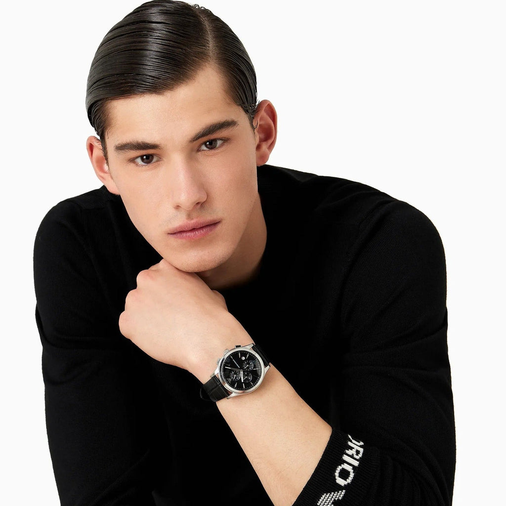 The Emporio Armani Paolo Chronograph delivers Italian sophistication on your wrist. This striking timepiece features a bold black dial paired with a refined black leather strap, creating a versatile look that transitions seamlessly from boardroom to evening. The chronograph functionality adds practical elegance, while the precision movement ensures reliable timekeeping. Built with Emporio Armani's signature design excellence, this watch makes a confident statement for the discerning man who values both style and substance.