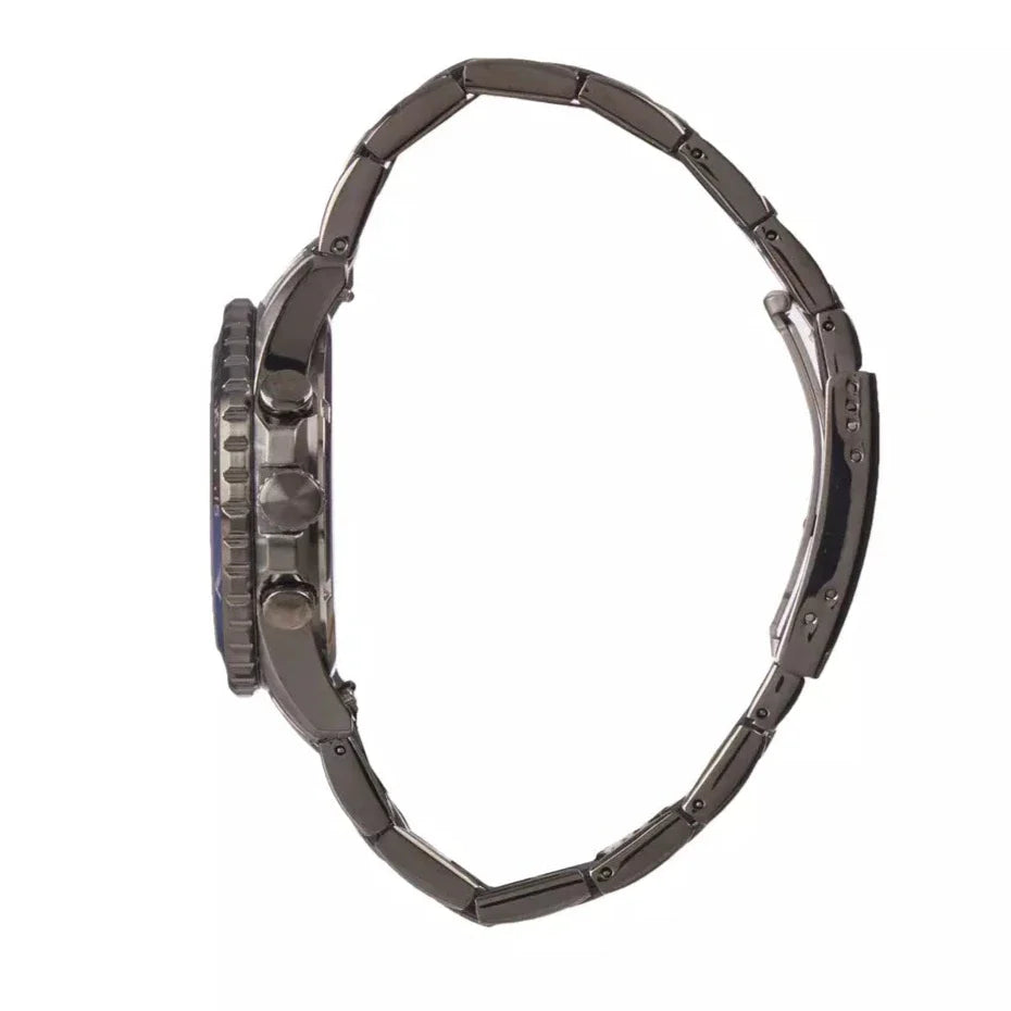 - Smoke stainless steel case with black sunray dial and blue and black bezel detail; smoke stainless steel bracelet band; links can be removed for a customized fit; interchangeable with all 22mm Fossil watch straps