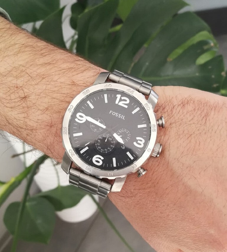 Fossil Nate Chronograph Black Dial Silver Steel Strap Watch for Men - JR1353