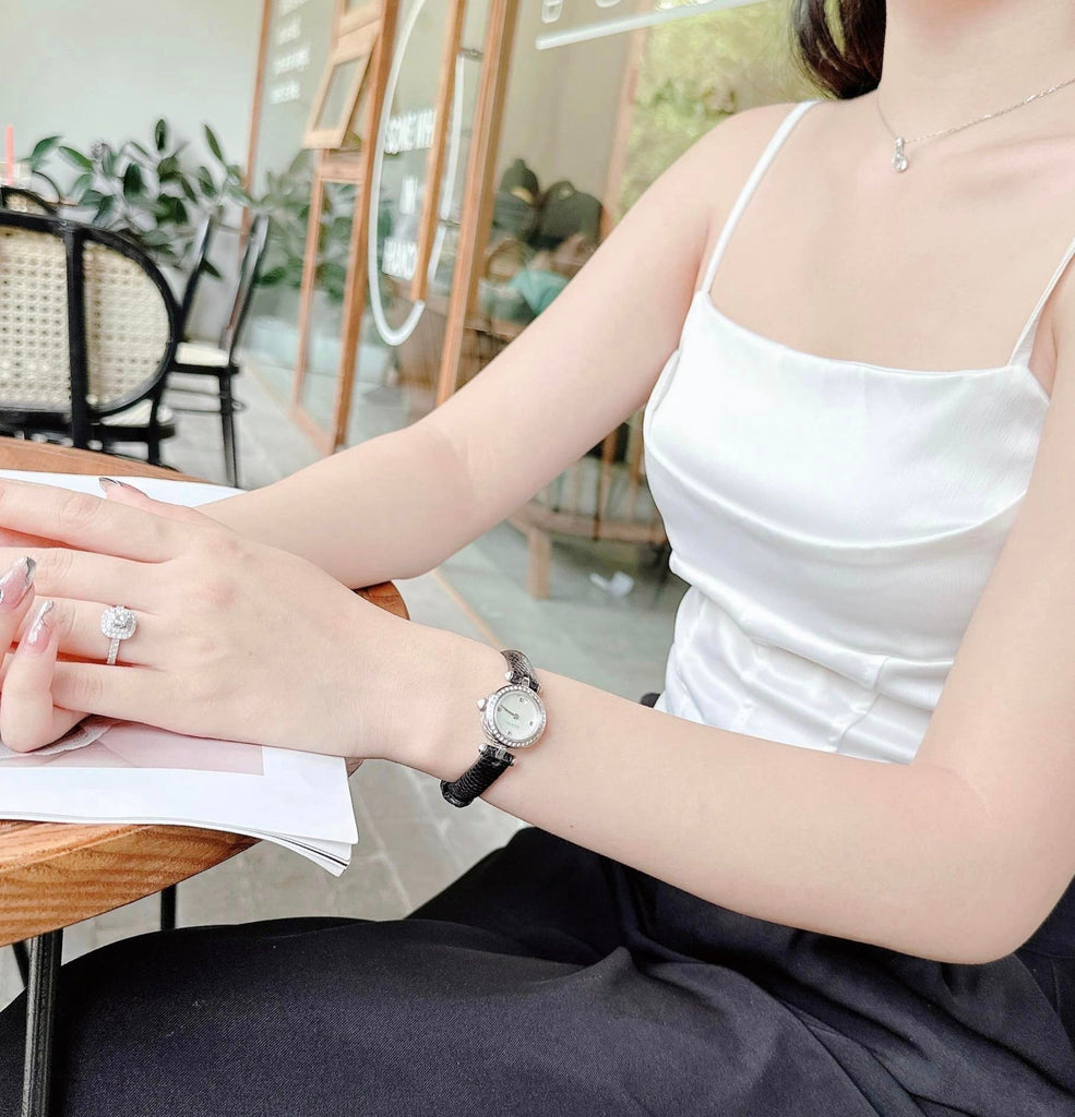 Stainless steel case with a black (lizard) leather strap. Fixed stainless steel bezel set with diamonds. White mother of pearl dial with silver-tone hands. Pryamid markers at the 3, 6, 9 and 12 o'clock positions.