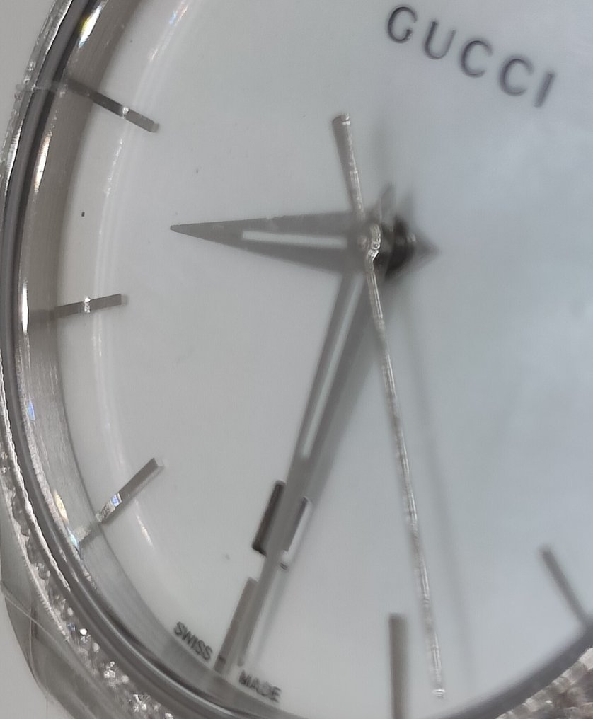 Quartz movement. Scratch resistant sapphire crystal. Pull / push crown. Solid case back. Case diameter: 38 mm. Round case shape. Deployment clasp. Water resistant at 50 meters / 165 feet. Functions: date, hour, minute, second. Dress watch style. Gucci G-Timeless White Mother of Pearl Stainless Steel Unisex Watch YA126444.
