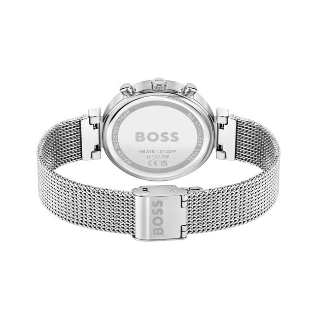 Hugo flawless 1502625 is a stylish womens watch with a stainless steel case in silver. This watch is fitted with a silver Stainless steel mesh bracelet with a width of 16 mm. The pink dial of the boss 1502625 is protected by mineral glass. The watch is water resistant to 30m. Quartz movement. Milanese clasp.