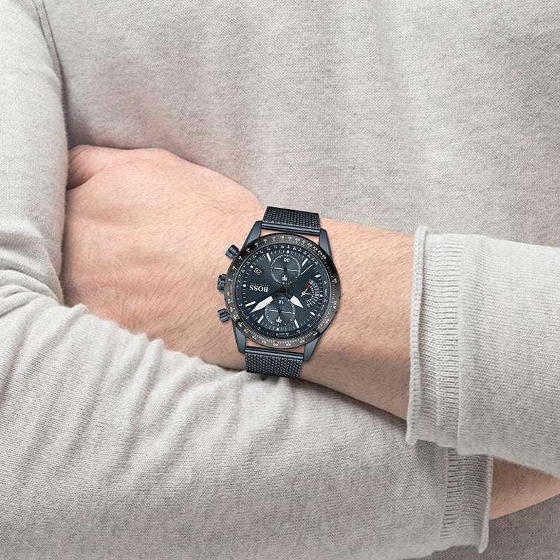 Command the skies with the Hugo Boss Pilot Edition Chronograph. This striking timepiece features a bold blue dial that captures the essence of aviation heritage, paired with a sophisticated blue mesh bracelet that adapts to your wrist. The chronograph functionality delivers precision timing for those who demand performance, while the pilot-inspired design makes a powerful statement whether you're in the boardroom or beyond. Built for the modern man who appreciates both style and substance, this watch transforms everyday moments into opportunities to showcase refined taste and confidence.