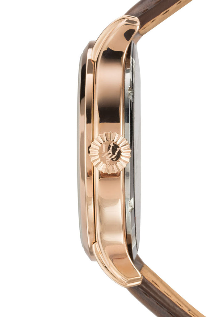 Rose gold-tone stainless steel case with a brown leather strap. Fixed rose gold-tone stainless steel bezel. Blue dial with rose gold-tone hands and index hour markers. Dial Type: Analog. Date display above the 6 o'clock position. Quartz movement. Scratch resistant mineral crystal. Screw down crown. Solid case back. Round case shape, case size: 42 mm, case thickness: 10 mm. Band width: 21 mm. Tang clasp. Water resistant at 100 meters / 330 feet. Functions: date, hour, minute, second. Casual watch style. Maserati Epoca Blue Dial Mens Watch R8851118001.