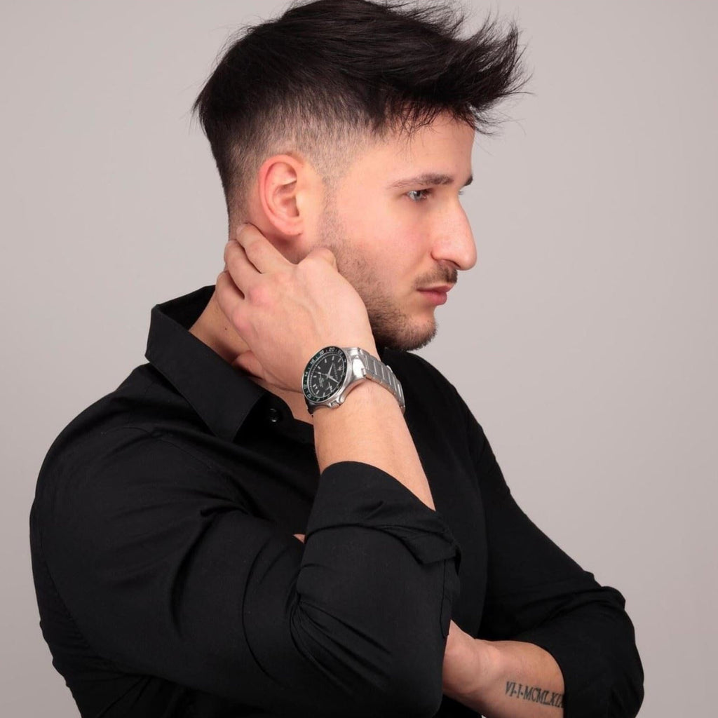 The black dial boasts silver baton-style hour markers and dauphine-style hands come with a luminous coating for enhanced nighttime visibility. It also features a green GMT hand that is used to match the reference time for the second time zone. Additionally, a date display is positioned at 3 o’clock; it is magnified by a cyclops lens.