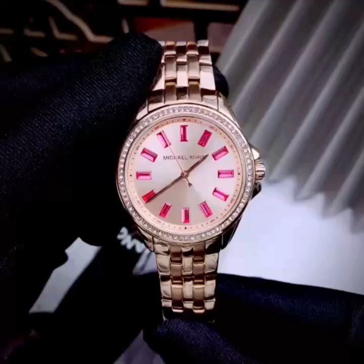 Rose gold-tone stainless steel case and bracelet. Fixed rose gold-tone bezel with crystal set. Rose gold-tone dial with rose gold-tone hands and crystal hour markers. Minute markers around the outer rim. Dial Type: Analog. Quartz movement. Pull / push crown. Solid case back. Round case shape, case size: 36 mm. Deployment with push button release clasp. Water resistant at 30 meters / 100 feet. Functions: hour, minute, second. Mini Pilot Series. Dress watch style. Michael Kors Mini Pilot Pave Quartz Gold Dial Ladies Watch MK7367.