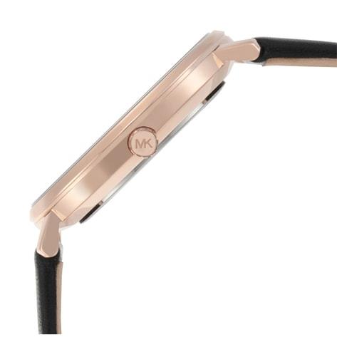 MK's Pyper watch is the definition of everyday elegance. Designed with a smooth leather strap, this rose gold-tone style features a minimalist dial. Wear it solo or stack it with coordinating styles for a glamorous effect. This 38mm watch features a white dial in a stainless steel case with three hand movement and a black leather strap.