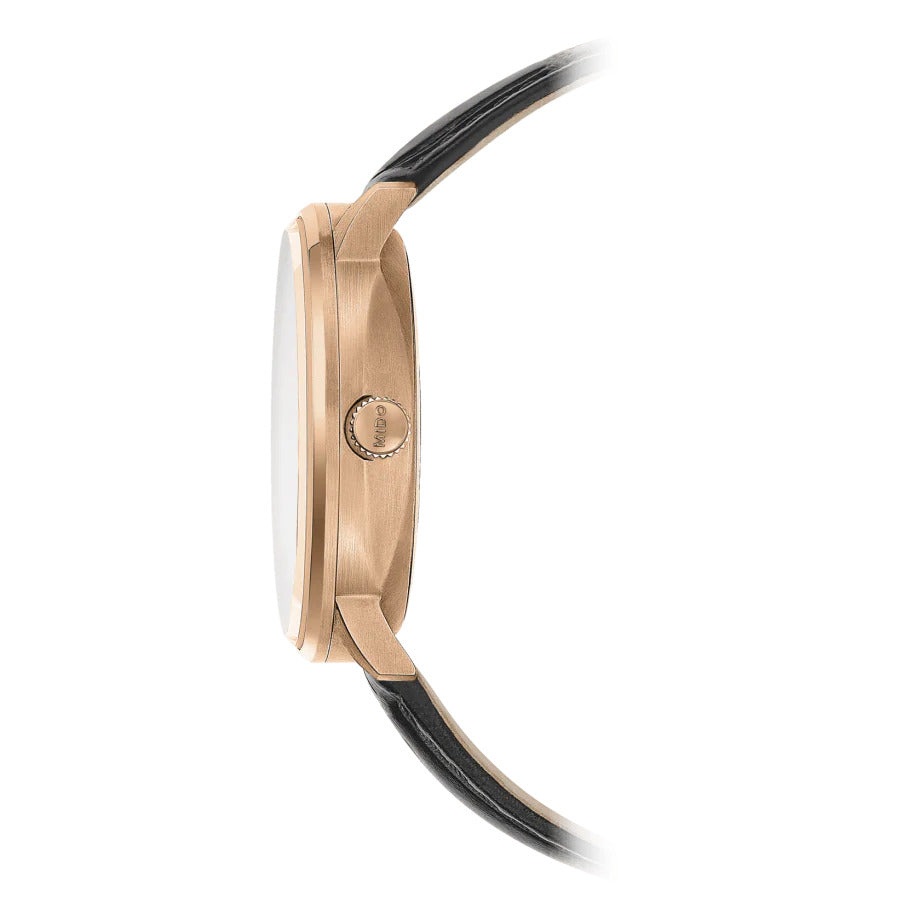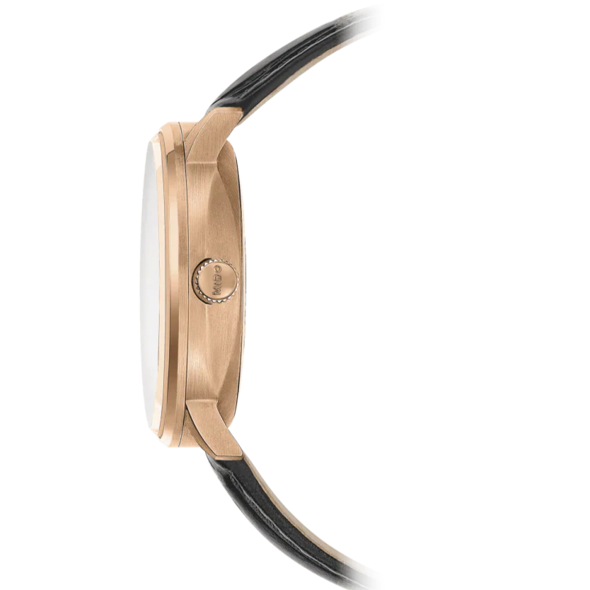 The Mido M021.407.36.411.00 watch has a case made of 316L stainless steel with a rose gold PVD finish, complemented by a leather strap. The Swiss mechanical movement Caliber 80 (based on ETA C07.611) with automatic winding ticks reliably in the case. It operates at a frequency of 21,600 semi-frequencies per hour, has 25 jewels and, above all, an extended power reserve of 80 hours. The operation of this movement can be observed by a transparent dial and also by a transparent dial. At the 3 o'clock position we find a practical date display.