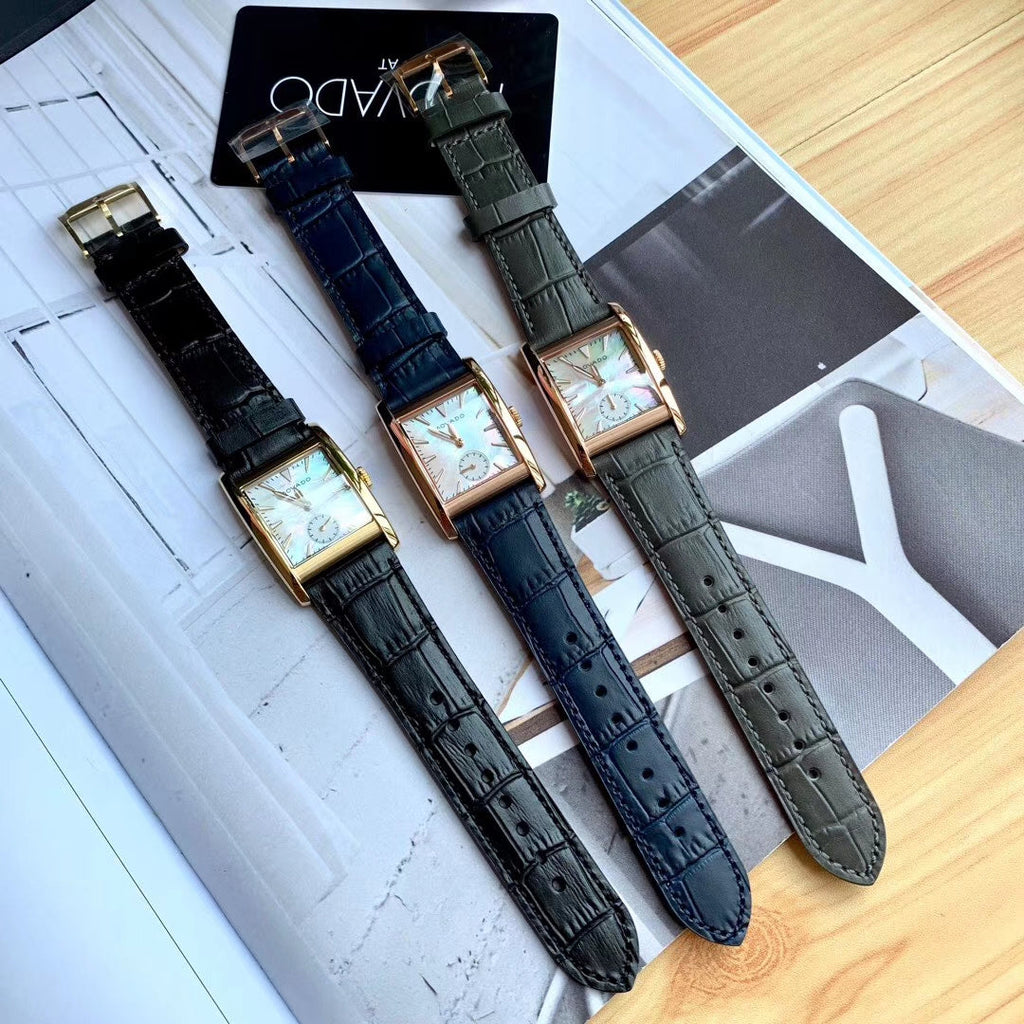 Gold-tone stainless steel case with a black leather strap. Fixed gold-tone bezel. White mother of pearl dial with gold-tone hands and index hour markers. Minute markers around the outer rim. Dial Type: Analog. Luminescent hands and markers. Small second sub-dial. Quartz movement.Scratch resistant sapphire crystal. Pull / push crown. Solid case back. Rectangle case shape. Case dimensions: 38 mm x 30 mm. Case thickness: 7.7 mm. Strap width: 20.5 mm. Tang clasp. Water resistant at 30 meters / 100 feet. Functions: hour, minute, small second. Luxury watch style. Watch label: Swiss Movt. Movado Heritage White Mother of Pearl Dial Ladies Watch 3650050.