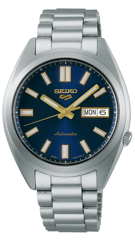 Silver-tone stainless steel case and bracelet. Fixed silver-tone stainless steel bezel. Blue sunray dial with gold-tone hands and index hour markers. Minute markers around the outer rim. Dial Type: Analog. Luminescent hands and markers. Day of the week and date display at the 3 o'clock position. Seiko Caliber 4R36 Automatic movement, containing 24 Jewels, bitting at 21600 vph, and has a power reserve of approximately 41 hours. Scratch resistant curved Hardlex crystal.