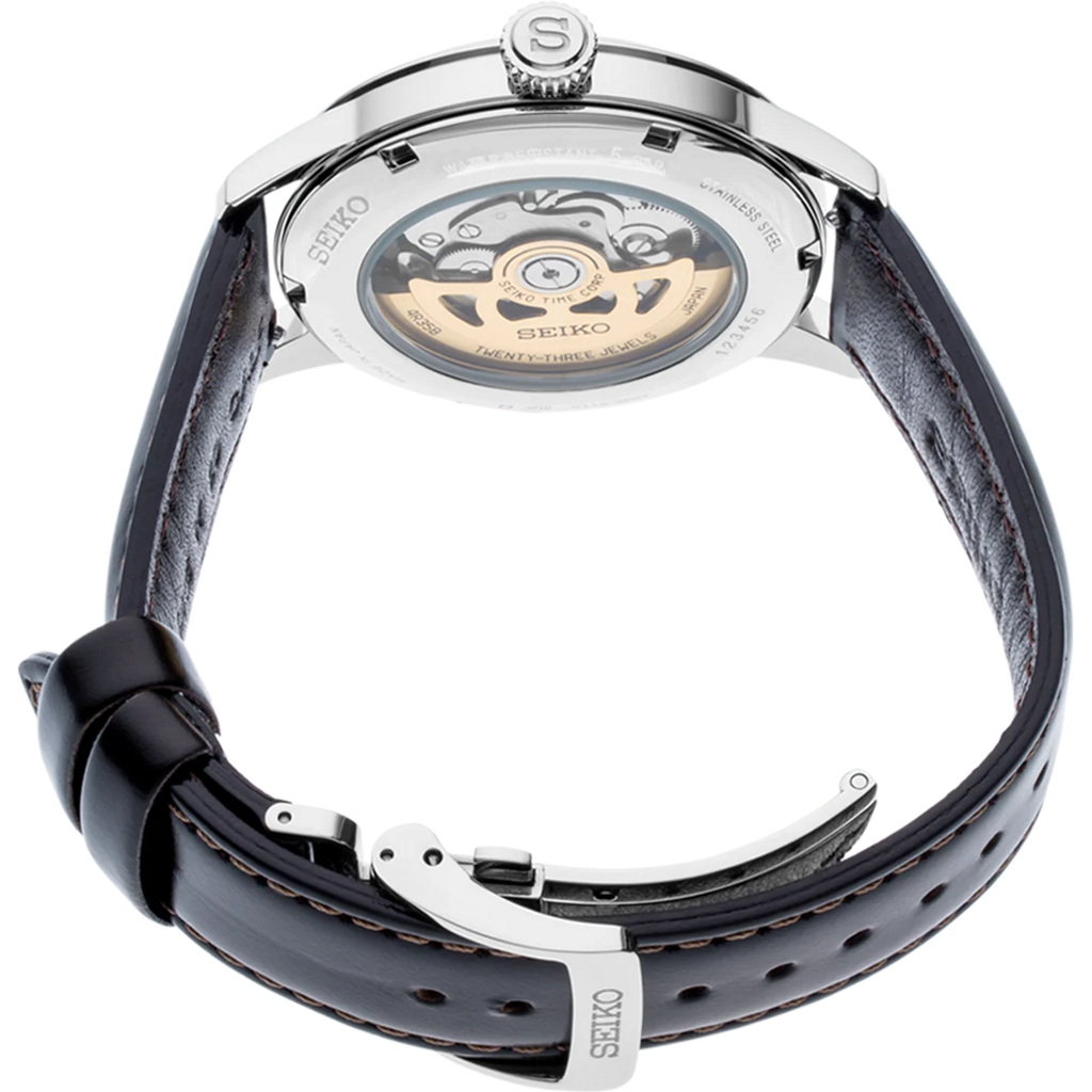 The models in the PRESAGE Cocktail collection are easily recognizable by their sunburst dial with a sunray effect. Their elegant aesthetic simplicity is in perfect harmony with Japanese tradition. The green of the dial of this model is inspired by the color of the "Mockingbird" cocktail, made with tequila, mint liqueur and lime. Paired with a dark brown leather strap for an elegant yet comfortable style, this automatic watch is simply perfect for any occasion.