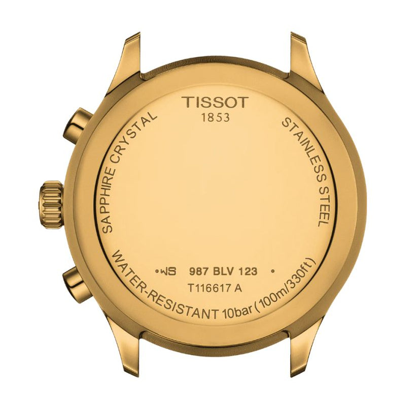 Brand New Authentic Tissot Chrono XL Classic Black Dial Gold Steel Men's Sports Watch Model T116.617.33.051.00. Gold Tone Stainless Steel case with Gold Tone Stainless Steel watch band. Deployment with Push Button clasp. Fixed bezel. Dial description: Gold Hands and Index Hour Markers with minute markers around the outer rim and 3 sub-dials on a Black dial. Quartz movement.