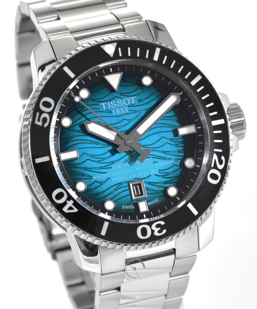 Stainless steel case with a stainless steel bracelet. Uni-directional rotating stainless steel bezel with an inlaid black ceramic ring. Blue gradient dial with luminous silver-tone hands and dot hour markers. Minute markers around the outer rim. Dial Type: Analog. Luminescent hands and markers. Date display at the 6 o'clock position. Powermatic 80.111 automatic movement, containing 23 Jewels, bitting at 28800 vph, and has a power reserve of approximately 80 hours. Scratch resistant sapphire crystal. Screw down crown. Transparent case back. Round case shape. Case size: 46 mm. Case thickness: 16 mm. Fold over clasp. Water resistant at 600 m / 2000 ft. Functions: date, hour, minute, second. Seastar Series. Dive watch style. Watch label: Swiss Made. Tissot Seastar Automatic Men's Watch T120.607.11.041.00.