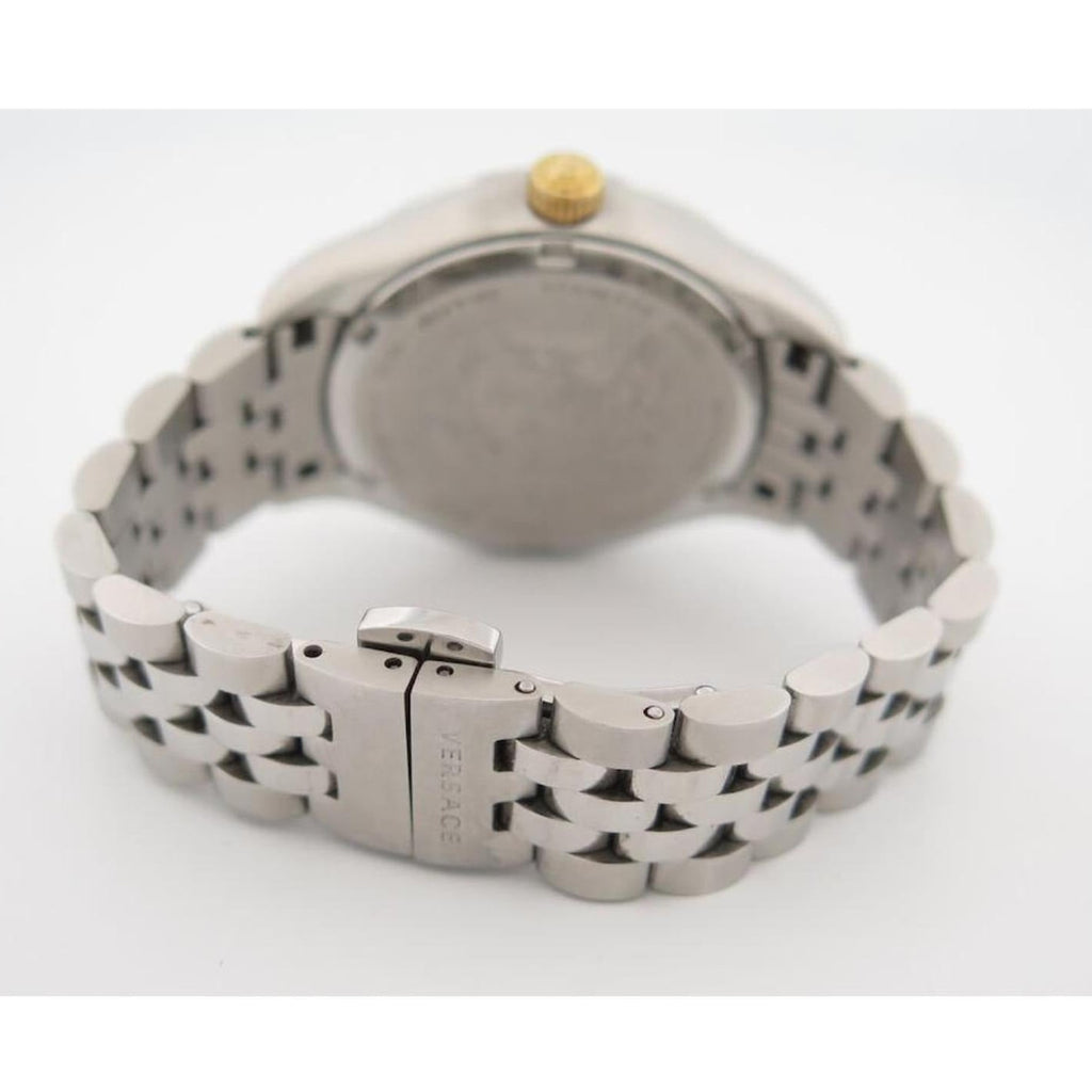 Silver-tone stainless steel case and bracelet. Fixed silver-tone stainless steel bezel. Silver dial with gold-tone hands and index-Roman numeral hour markers. Medusa head marks the 12 o'clock position. Dial Type: Analog. Luminescent hands. Quartz movement. Scratch resistant sapphire crystal. Pull / push crown. Solid case back. Round case shape, case size: 35 mm. Deployment clasp. Water resistant at 50 meters / 165 feet. Functions: hour, minute. Hellenyium Series. Casual watch style. Watch label: Swiss Made. Versace Hellenyium Quartz Silver Dial Ladies Watch VE2S00322.