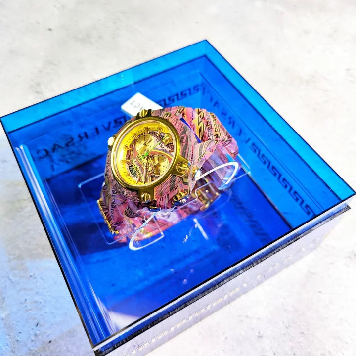 VEZ701222 RONDA 502.1 D Swiss Chrono Quartz 44 mm Pink Rainbow Greca Pattern transparent polycarbonate round case; IP Champagne cage with 4 screws on top ring Pink Rainbow Greca pattern dial with Medusa head, Versace Logo at 12h and colored details Transparent Pink Rainbow Greca pattern PU strap with metal loop with Greca at 6h and tongue buckle 3 ATM