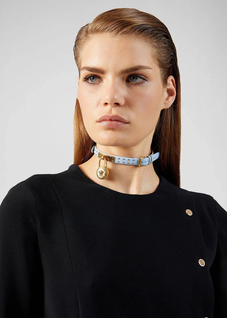Gold-tone stainless steel case attached to a light blue leather strap set with icon studs. Fixed (greca pattern) gold-tone bezel. Gold dial with gold-tone hands. Dot markers at the 3, 6, 9 and 12 o'clock positions. Dial Type: Analog. Quartz movement. Scratch resistant sapphire crystal. Pull / push crown. Solid case back. Round case shape. Case size: 21.5 mm. Case thickness: 8 mm. Tang clasp. Water resistant at 30 meters / 100 feet. Functions: hour, minute. Medusa Lock Icon Series. Dress watch style. Watch label: Swiss Made. Versace Medusa Lock Icon Quartz Gold Dial Ladies Watch VEDW00419.
