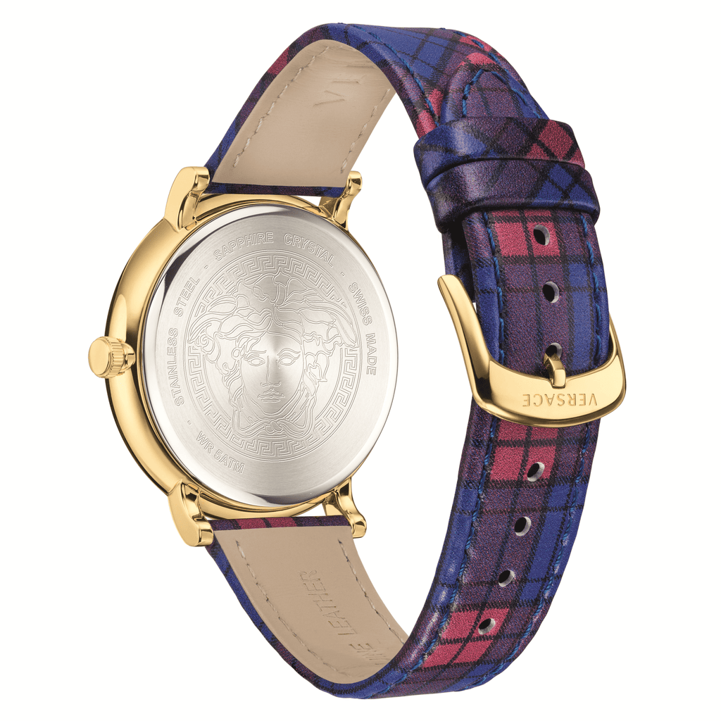 Embrace bold style with the Versace V-Circle watch for women. This Clans Edition timepiece features a striking black dial and eye-catching red & blue leather strap. Made from premium materials, it's a luxurious accessory that adds both fashion and function to your look. Elevate your wardrobe with this must-have watch.